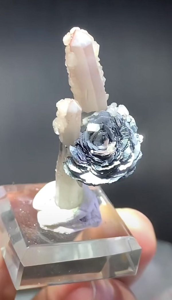 “晶花雪月”是一块令人惊叹的矿石,其顶部是白色柱状的方解石,晶莹剔透,闪烁着柔和的光泽。柱状方解石的层次分明,边缘清晰,仿佛是大自然精心雕琢的艺术品。下方伴生着蔷薇形状的白云母,如同一朵盛开的花朵,增…